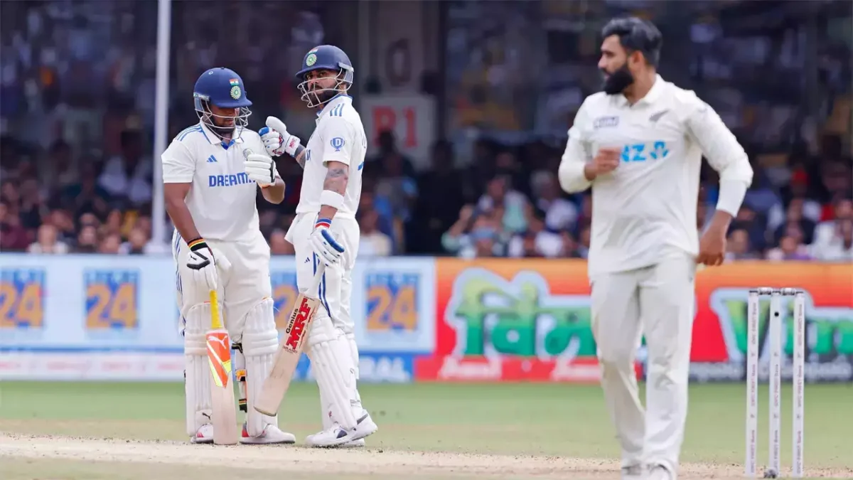 Skipper Rohit scored a smooth 52 while Virat Kohli scored 70 runs before getting out in the last ball of the day of Glenn Phillips. Sarfaraz Khan who forged 136 runs vital partnership for the third wicket with Kohli is unbeaten on 70 off only 79 balls. After Rohit’s dismissal, the duo of Kohli and Sarafaraz took the Kiwi bowlers to the cleaners to release the pressure and take India to a strong position in the game.
